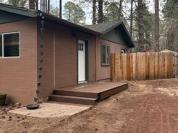 Cozy furnished 2 bedroom, 1 bathroom, home in the pine trees available for medium term rental. Wood stove, fireplace, and mini split heating and cooling. Amazing location in the Mountainaire community, within a short walking distance of the Mountainaire Country Store and Tavern, and with miles of hiking and biking in the Coconino National Forest nearby. Just a few minute drive to the Flagstaff Airport and all the amenities of downtown Flagstaff. Dog friendly with a fenced back yard and a washer and dryer in unit. Two queen beds and one twin. Minimum rental term is 30 days, maximum is 180 days, with flexibility to prorate to an exact term with anything in between. This is a no smoking property. No cats please. Dog friendly up to two dogs with additional fees. Water, gas, electricity, and trash utility fees included in base rate. $100 utility fee for internet. Can be negotiated and removed, if not needed / used. 30 day minimum rental period, 180 day maximum. Tenant responsible for repairing any damage caused by pets and a cleaning fee upon move out.