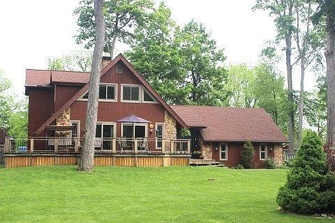 ATTRACTIVE HOME WITH AN AMAZING OUTBUILDING! Walk into a GORGEOUS GREAT ROOM with hardwood floors, floor-to-ceiling 2-sided stone fireplace, open staircase to both upper and lower levels and sliders to a wraparound deck. The kitchen features Maple cabinetry, cooktop island, breakfast bar, and pantry. The main floor master suite has an attached screen porch with hottub overlooking the backyard. Upstairs in this UNIQUE A-FRAME HOME are 2 nice sized bedrooms and full bath along with a loft area overlooking the Great Room. Basement is fully finished with yet another fireplace, bar, 4th bedroom, and 1/2 bath. Home has a fenced-in backyard and an AMAZING ALMOST BRAND NEW 30 x 40' Stick Built Outbuilding. Building is fully insulated, drywalled, 110 and 220 outlets, car lift, and heated. Be sure and ask your Realtor for a list of the amenities this home has! The NEW ITEMS include Central Air, Windows, and Water Softener along with many many more updates! Thank you for considering this home