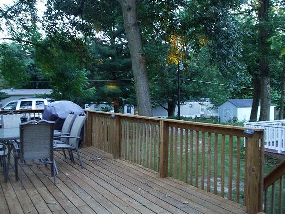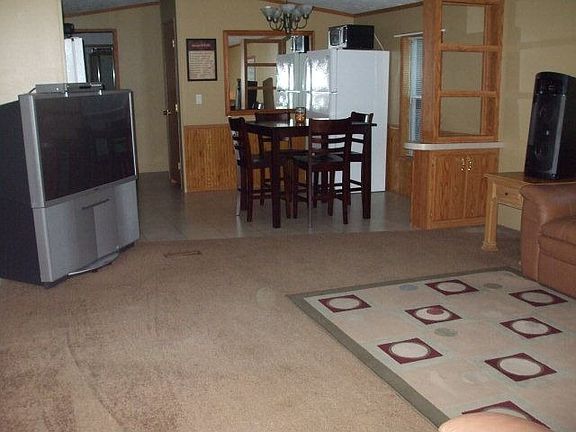 Mobile is on a beautiful 50x253 ft lot. This in a wonderful mobile with lots of improvements, including a 32 x 11 deck, a 12 x 10 shed for golf cart, lawn or boating equipment. It comes with a dock space large enough for your pontoon or ski boat. There is a fire pit in the back yard for those cool nights of marshmellow roasting. Must see to appreciate. LOT RENT is $195 per month. Eat in Kitchen/Dining is L shaped. If Closed by 10/30/13 no lot rent will be due until March 1, 2014