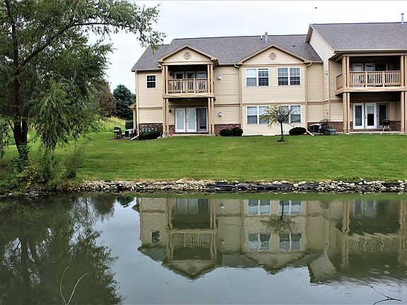 Condo living at its finest! You'll enjoy the open concept floor plan as soon as you enter this beautiful 2 bedroom, 2 full bathroom condo. Boasting huge cathedral ceilings, this newly painted unit has brand new carpet throughout. Just off the oversized living room with built in gas log fireplace, you can step out onto your covered deck overlooking the water. Attached garage with private stairs, will lead you right into your kitchen. All appliances stay... stove, microwave, refrigerator, washer and dryer. Commons area includes pool, clubhouse and exercise room. Condo fees include lawn care, snow removal, exterior maintenance and insurance, trash, as well as maintenance of clubhouse and pool.