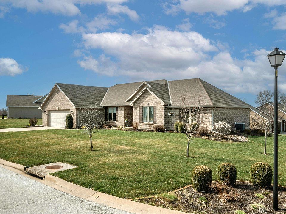 This sun-drenched 2015 brick ranch in the much desired Stone Crest neighborhood offers many great features including some ADA features such as zero entry, no stairs, and wheelchair accessibility with wide doorways and hallways all on one floor. The living room has a gas fireplace and the kitchen is a chef's delight with solid surface countertops, an island, and two areas for informal dining. The sunroom, perfect for reading and gathering, is a wonderful asset and then there is the 13x28' in-ground pool that is sure to be a summer attraction. The master suite includes a large walk-in closet and huge master bath. The quality flooring is manufactured hardwood, ceramic tile, and luxury vinyl plank. The oversized garage offers extra storage. All pool equipment conveys including the Dolphin vacuum, skimmers, and hand rail. The pool has a roller cover and a ledge for young children. It has a depth of 5' in the center and 3' around the sides. The 28 ft length is great for swimming laps. There is a lawn irrigation system, too. The white hutch in the dining room and bedroom drapes do not convey. (Curtain rods do convey.)