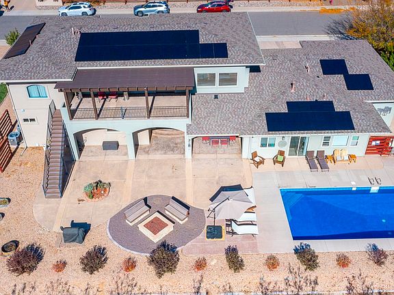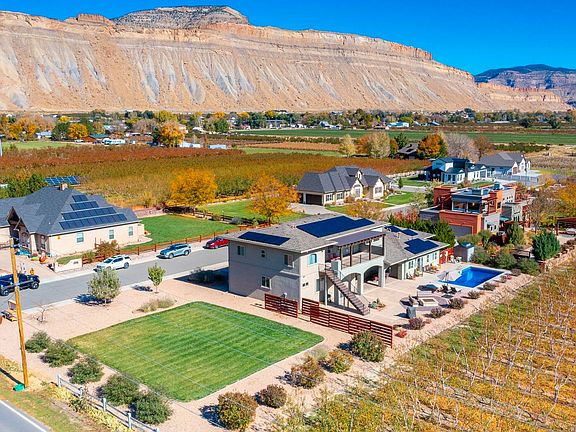 ***EXCLUSIVE FINANCING OFFER ON THIS HOME ONLY. SELLER TO SUBSIDIZE BUYERS PAYMENT FOR UP TO 2 YEARS. BUYER TO RECEIVE UP TO 2% BELOW MARKET RATE WITH A 2/1 TEMPORARY BUYDOWN STRATEGY* Custom built Palisade chateau on a half-acre established corner lot with quintessential views of Mount Garfield and adjacent orchard that encapsulate premier and coveted Palisade Wine Country living! Enjoy energy efficient and sustainable living with OWNED solar package, which substantially reduces electric bills! Entry through the custom solid wood door ushers you into a home that's been thoughtfully designed, with abundant and useful space, a neutral color palette and premium finishes and features throughout! Open living/kitchen area is accented by gas log fireplace, for added ambiance. Chef's quality kitchen boasts premium cabinetry adorned by upgraded granite counter tops, too-of-the-line stainless appliances, tile backsplash and a large walk-in pantry for all your storage needs! Convenient eat-in kitchen area overlooks the adjacent orchard views, with an additional formal dining room, fit to host the most spectacular holiday gatherings and entertaining nights! Junior suite on main level features attached bath with walk-in shower; perfect guest quarters for added privacy! Additional office area and spacious laundry room on main level for ease of access. Upper level offers an OVERSIZED family room/bonus room that is fit for family movie nights, kids' landing pad or play/flex area! Primary suite on sits through lovely french doors, with abundant closet storage space and spa-like attached bath that offers a relaxation haven with freestanding tub, dual vanities with stunning granite counters and a generously sized walk-in shower with bench seating and several built-in tile niches. Two additional bedrooms on the upper level share a full bathroom that offers plenty of solid surface counter space, dual vanities and a convenient tub/shower combo! Stellar added BONUS of having the attached ADU unit, which consists of kitchen/living room combo, one bedroom, 3/4 bath and dedicated laundry area to use as short term rental or extended generational living quarters! Two expansive patios on the south side of the home offer picturesque views of the Grand Mesa and surrounding Valley! In-ground swimming pool, built-in gas fire-pit with surrounding bench seating, embedded steel trough planters and privacy paneling that creates a more intimate area to enjoy the outdoor amenities!