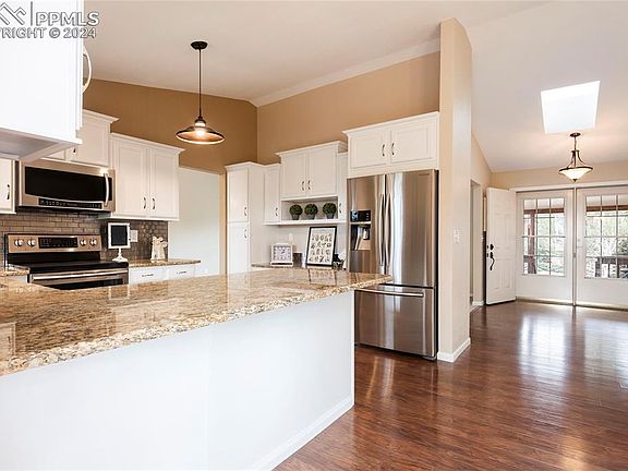 Gorgeous light and bright Briargate 5 Bed in Windjammer! Double entry doors, enjoy an oversized Master retreat with 5 piece spa bath, Dual Master Closets, Plantation shutters. New Carpet throughout, Brand new architectural roof 12/23, Central Air, Updated Kitchen is a cook's dream with slab granite counters and soft close doors and drawers, Stainless appliances, ample cupboards and lighted desk area, Huge Laundry with utility sink and front load washer and dryer included. Oversize driveway and garage. Plenty of room for a shop. All new skylights (2 with screens and remotes). Ton's of storage. Surround sound and theater prewires. Real wood burning fireplace. Extra bonus room in the lower for retreat/office/craft. Parklike backyard with large deck areas for entertaining. Convenient location with easy access to Powers, I25 and Briargate PKWY and Woodman. Close to parks and dog park. Ton's of updates. Coveted D20 Schools, Mountain Views! This beautiful home won't last!