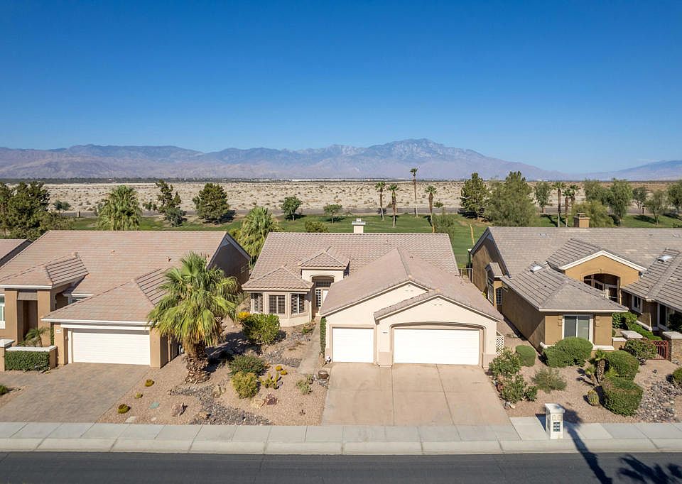 Sun City Palm Desert - St. Croix. Located high above the 4th fairway, this version of Sun City's most popular greatroom floorplan has a 3-car garage and provides panoramic golf course and mountain views including the peak of Mt. San Jacinto. The extended salt-finished patio has an alumawood patio cover, built-in BBQ, retractable solar shades and lush desert landscaping. Inside, diagonally laid tile is in all but the bedrooms and den. Shutters are throughout. The greatroom has a tile trimmed gas fireplace with custom built-ins to each side. The kitchen has corian counters, a breakfast bar, wall oven and cabinets with inset glass and a desk unit. Raised panel maple cabinetry is in the kitchen and bathrooms. A spacious den/office is off the main hallway. The huge primary suite has a bay window and large walk-in closet with mirrored wardrobe doors. The primary suite bathroom has a vanity with dual sinks and corian counters; a stall shower with textured glass doors. A tub/shower is in the guest bathroom. The laundry room has cabinets and a utility sink. The 3 car garage has an epoxy floor, a utility sink and its own AC.