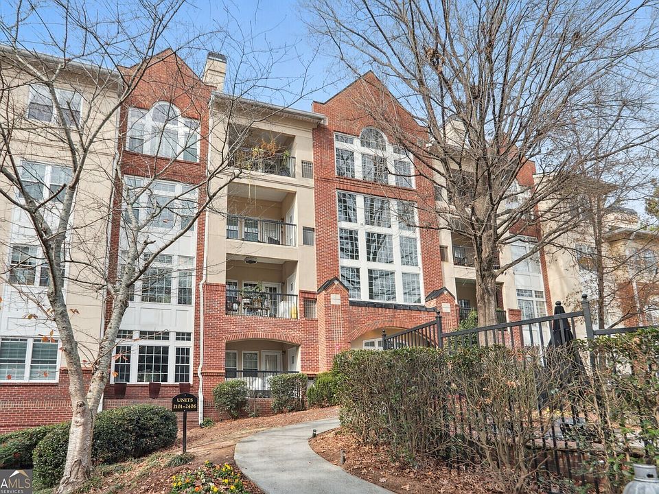 Heart of Buckhead gated community. Move in ready. Dramatic vaulted ceiling in living room with Palladian style window, handsome fireplace and built-in bookshelves. Light-filled end unit. Separate dining room. Balcony. Two newly renovated bathrooms. New HVAC system. Freshly painted. Large primary walk-in closet and en suite bath with double sinks, separate shower and luxurious bathtub. Second bedroom perfect for office or study. Clubhouse with fitness center. Private pool. Dog walk. Large mailboxes securely located in front entrance hall. Walk or run to nearby Chastain Park. Fine dining and shopping located minutes away. Enjoy TWO PARKING SPOTS, one in the covered garage with easy accessibility to an elevator. The second parking space is clearly marked by sign near the front door. This one is waiting just for you!