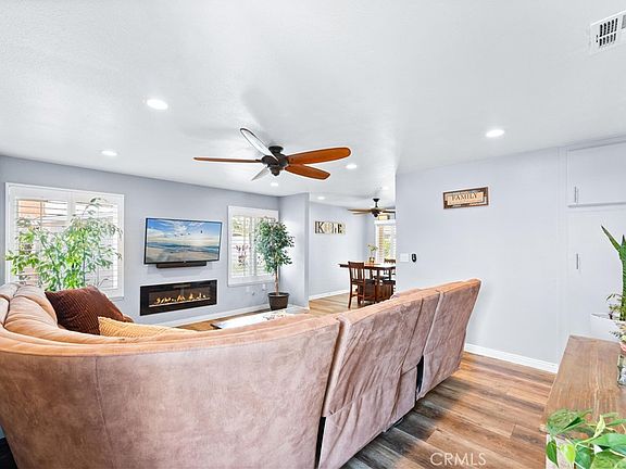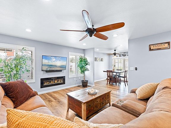 Step inside to find modern vinyl plank flooring throughout, complemented by elegant interior shutters, recessed lighting, and ceiling fans in both the family and dining rooms. The inviting family room features a cozy electric fireplace, creating the perfect spot to relax and unwind.