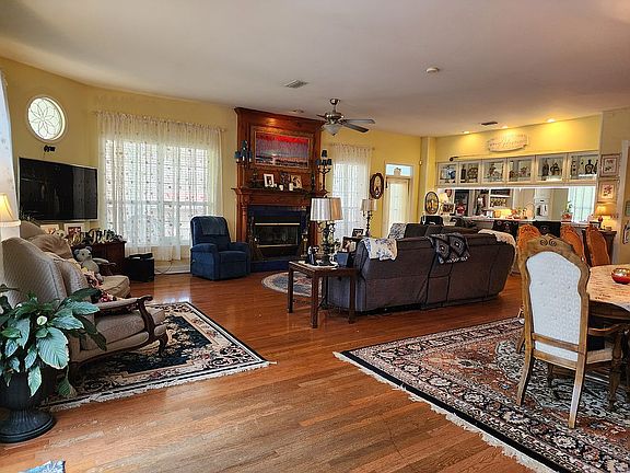 The open living/dining room has a huge beautiful wood burning fireplace with oak columns, mantel, and large windows overlooking a backyard meant for entertaining.