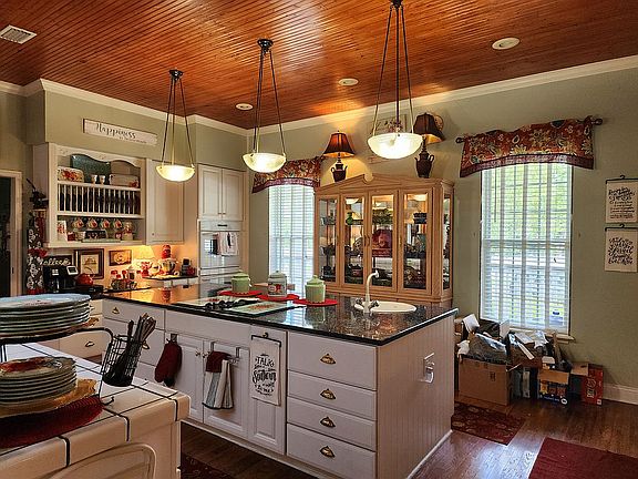 The huge gourmet country kitchen boasts custom white cabinets, a huge island with granite countertop, a glass top 5 burner stove, 2 sinks with garbage disposal, double wall oven and beadboard ceilings. It is open to the living/dining room with a bar top partial wall so you are always part of the conversation.
