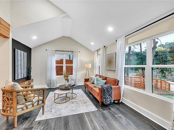 One of Hapeville's finest homes is ready to Welcome you home. This well-built beautiful modern contemporary cottage combines both charm and style. Location is everything, and this home offers amazing convenience to Porsche Ave, next to Porsche North America, only minutes from Delta Headquarters and Hartsfield-Jackson Airport, and within walking distance to local restaurants and the theater. Newly constructed with care from top to bottom, this home features a new roof, updated systems, and gorgeous walnut wood floors and special features. The spacious living room has a vaulted ceiling, a unique accent wall with a custom shelf, and plenty of natural light pouring in from large windows. A beautiful cedar beam leads into the gourmet kitchen, which is a standout. It comes with high-end ZLINE black stainless steel appliances, a two-tone custom cabinet design, matching vent hood, a farmhouse sink, sleek granite countertops, and an elegant backsplash, suitable for preparing homemade meals and making memories. Master on the main has private side entrance with a spa bathroom with quartz counters and a stylish tiled shower. As you make your way upstairs the master suite beams tons of natural light, an accent wall, and a cool glass barn door leading to a dream bathroom stunning tile and wet shower with soaking tub, ideal for relaxing. Twilight exposes the home's exterior lighting beauty, creating a welcoming atmosphere and illumination. The enormous private backyard is fenced, tile patio for outdoor chilling, grilling and lazy days. The home offers enjoyable outdoor living and space to create additional amenities. The opportunity awaits to make this stunning home yours with the perfect mix of style, charm, tranquility and positioned perfectly for the growing neighborhood! Incredible Development across the street presents great investment opportunity!