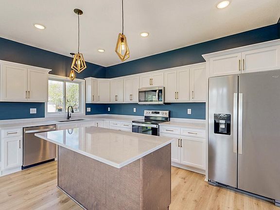 Traditional split-entry layout, but with modern flair and finish. Large primary suite with private bath (tile shower, double sink and walk-in closet); second bedroom or office also on the main-floor. Quartz tops, giant pantry, and center island show well in the kitchen/great room. Fully-finished basement with a large secondary living space, two more bedrooms, and a good-sized laundry room (finished). Three-car garage, full sod, many more amenities!