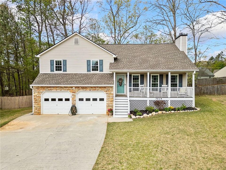This wonderful home features a huge Living Room with a fireplace, The Lower Level has a bonus room that could be an office, playroom, family room, rec room, or room for exercise equipment, with an adjacent half Bath. A Chef's kitchen has an island, double sinks, and Stainless appliances including a gas stove. Enjoy your meals in the sunny dining area. The upper level has a Primary Bedroom with a walk-in Closet, and double sinks, complete with a separate Tub and Shower. Two other bedrooms with hall bath. Enjoy a cup of coffee on the Rocking Chair Front Porch and watch the kids in the cul-de-sac or enjoy eating out on the back deck or relaxing in the Hot Tub. Close to schools and shopping. Multiple Offers. Highest and Best by 12:00 Wed April 9th.