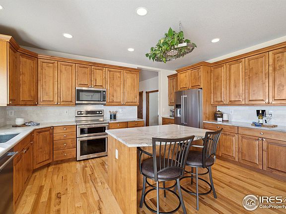 **NEW PRICE** Welcome to this exclusive slice of tranquility. This property features an end of cul de sac location, with 70 acres of open space around the neighborhood which makes a gorgeous place to relax, unwind, entertain and get away from the bustle of the city while being 5 minutes from Downtown Berthoud. Enter your maturely landscaped property complete with apples, peaches, grapes and freshly trimmed trees. The home is adorned from top to bottom with beautiful solid knotty alder wood . Enter your kitchen and behold the brand new solid quartzite counters with marble backsplash, extensive 42 inch cabinets, newer Kitchen Aid stainless steel appliances, generous walk in pantry and open floor plan. The main level is great for entertaining with loads of living space, a formal dining room, Family room, formal living room, eat in area, large laundry room and loads of windows. Upstairs you'll find a huge primary suite with views of Longs Peak and the foothills, appointed with soaring ceilings and primary bath with jetted soaking tub, dual vanities, large closet and spectacular views of the property. Three additional bedrooms upstairs are all oversized and share a dual vanity full bath. The basement features a large living room, 2 large bedrooms (one of them is currently a gym) and a storage/ possible kitchenette area. Don't miss one of the most unique features of this property, an outbuilding that houses a saloon! Install all your favorite games into this finished heated space with loads of windows, and beautiful accents. The rest of the outbuilding is to suit your needs and taste, and it has electricity and running water . A 3 horse barn with runs has room for your horses or other livestock to live and shelter, and a garden shed will hold all your necessary implements for creating an organic feast from the garden. Please see the accompanying list of the recent updates and upgrades made on this home. The list is extensive and there is not room to list it all here.
