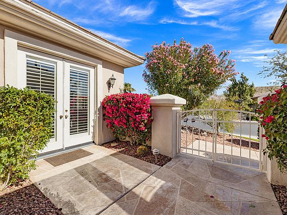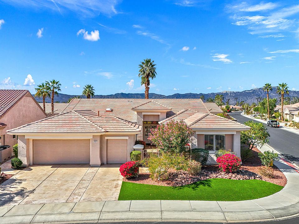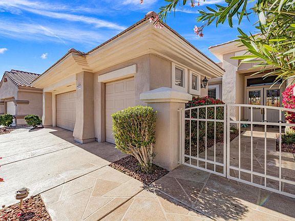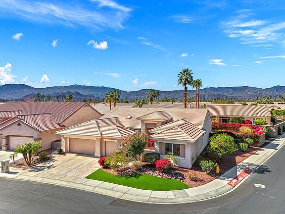 55+ Sun City Palm Desert. Del Webb's ''BEST BANG FOR YOUR BUCK'' active lifestyle community in the desert. This popular Monaco model is fully extended and sits on a spacious 12,000+ sq. ft. corner lot in great central location near the Sunset View Clubhouse. Patio is extended with raised in-ground SPA with waterfall, Alumawood awning, custom overlay throughout front yard and backyard. Beautiful curb appeal, gated courtyard, double door entry with custom glass inserts. Inside, carpet in desert tones,16 inch diagonal tile, plantation shutters, Living room and dining area has wall of windows and slider to view of the spa and patio. Kitchen has large chefs island, new appliances, stainless cooktop, upgraded cabinets, recessed lights, skylight for extra brightness. Family room is open concept with kitchen and nook. Master suite is extended with slider out to patio, plantation shutters, bath has double vanity, make-up counter, glass block over tub, and walk-in closet with organizing system. Guest bedroom (attached casita) is extended with double French doors to courtyard, ensuite bathroom with tub. Bedroom #3 has plantation shutters and Jack and Jill bath with skylight. Laundry room is set up for an office with built-in cabinets. Patio is extended with custom SPA and waterfall, sitting areas and lush landscaping, misting system, retractable screens, and quality turf installed front and back. Garage is extended with floor mats, washer and dryer, included, sink, and one newer A/C and one original A/C. Solar system installed with lease approx. 234.00/mo. ''Buy Where you Love to Play....SUN CITY PALM DESERT IS ALL ABOUT LIFESTYLE!! It has many clubs, activities, amenities, and low HOA dues. Play at 2 championship 18-hole golf courses and practice facilities, pickle ball, tennis, softball, bocci ball, 18-hole miniature golf course, an honor library, arts and crafts, a ballroom for special entertainment, and 4 saltwater pools kept at 87 degrees with hot tubs. Enjoy 2 great restaurants, a martini/coffee bar, and even a post office. It has a newly renovated classy indoor/outdoor bar with fire tables to enjoy the awesome views and our beautiful desert weather. y Palm Desert''