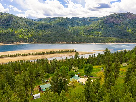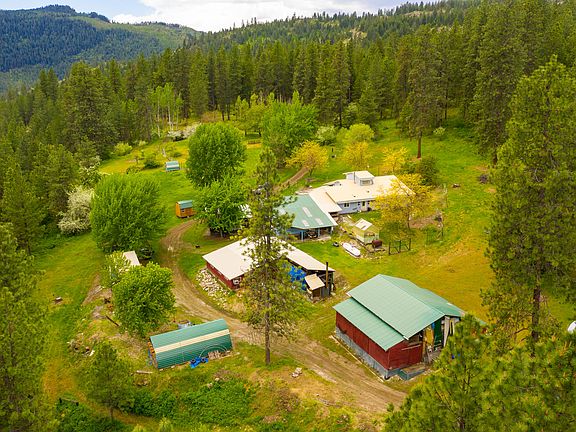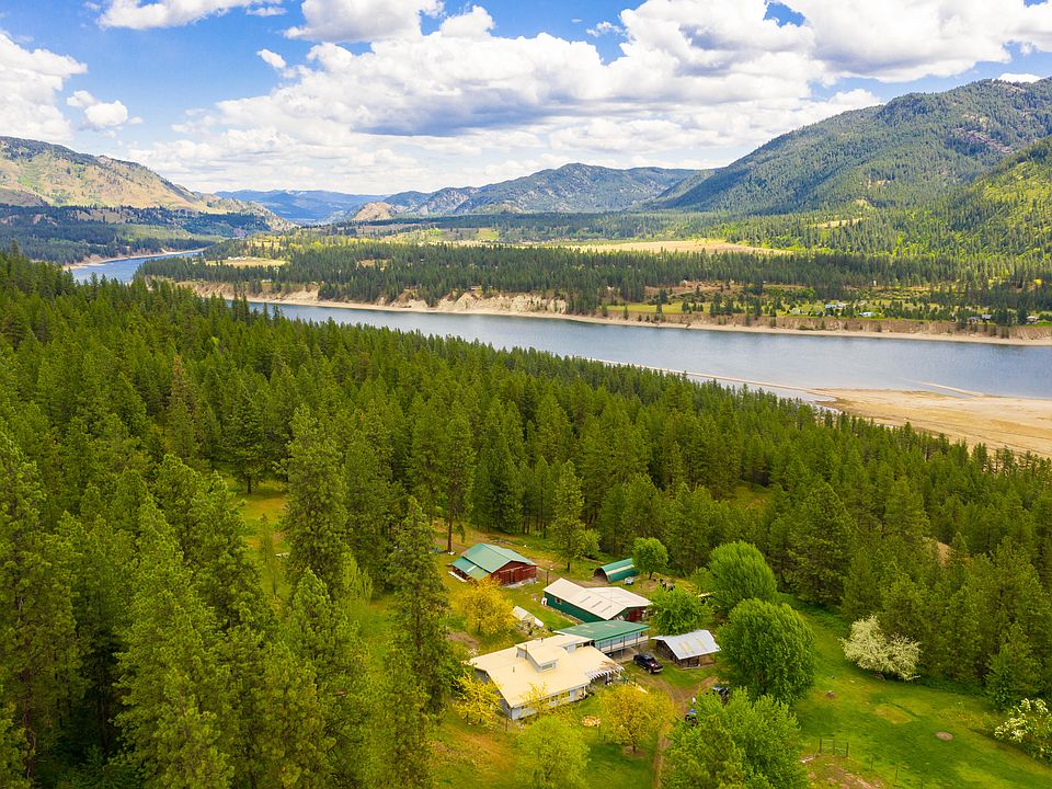 One of kind property offering end of the road solitude w/beautiful views of Lake Roosevelt & 1310 access! The unique 2380 sq. ft 3BR/2BA home sits on 48.43 gorgeous acres. Originally a one room log home, the one level home has a Pellet Stove, Radiant heated floors (in the shop too), spacious Kitchen, super cozy Sunroom & lots of storage in the home or in the 40 x 45 Barn and Shop. A Wood Boiler heats the radiant floors. Grow lots of veggies/fruit in the large, fenced garden. Property slopes down to a very nice bench which then leads down to the Government frontage. A very peaceful setting.