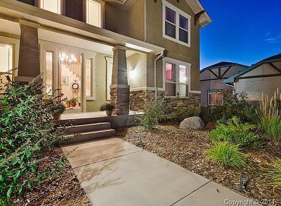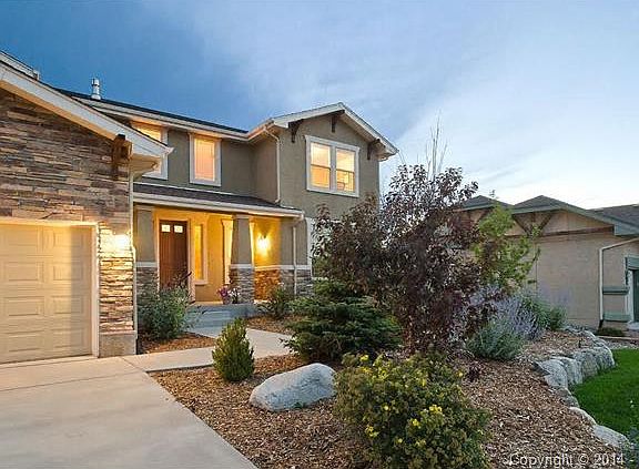 Stunning Upgraded Stucco & Stone Craftsman Style Home in Desirable Pine Creek~Pikes Peak Views~D20 Schools~Oak Floors,Custom Window Coverings, AC, Dual Water Heaters~ Formal LR & DR~Island Kitchen w/Nook & SS Appl~ML Office~ML Laundry & Half Bath~2-Story Great Rm w/Built-Ins~3BRS + 2Baths Up~MBR w/Pedestal FP & 5-Piece Master Bath~Huge Walkin Closet~Fin 9ft BSMT has Rec Rm w/FP & plumbed for Wet Bar, 2BRS & Bath, Large Storage Space~3-Car Gar~Professionally Landscaped~Close to Hospital, Shopping, Lifetime Fitness, YMCA. Beautifully Upgraded 2-Story home on .27 acre fenced lot. Professionally landscaped w/lg concrete patio & Pikes Peak views! 8ft front door w/stained glass sidelights. 2 story entry w/decorative light fixture, inlaid entry oak floor & curved staircase to UL. Archway into formal LR w/built-in oak bookcases & formal DR w/oak floors, tray ceiling & decorative light fixture. Gourmet island Kitchen boasts oak floors, pantry, raised panel cherry cabinets, Silestone counters & pullouts. Eat-in Nook opens to yard and Great Rm. SS appl incl dishwasher, built-in microwave, double ovens & gas range. 2-story Great Rm has a ceiling fan, entertainment recess, built-ins & mantle. The Great Rm shares a dual sided gas-log FP w/the ML office with French door entry. Double doors lead to UL MBR w/coved ceiling, lighted ceiling fan, plantation shutters & pedestal FP. The 5-pc Master Bath has tile floors, raised vanity w/dual sinks, soaking tub, tiled shower w/built-in seat & mirrored wardrobe doors for huge his/her closet w/built-ins. A catwalk overlooking the Great Rm leads to 2 UL BRs & full Bath w/raised vanity, linen closet & tiled tub/shower. Fin BSMT w/9ft ceilings, storage, Rec Rm w/built-ins & FP. Pre-plumbed for wet bar. 2 spacious BRs & three quarter bath.