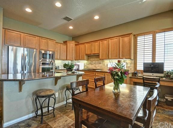 Outstanding single story Olinda Ranch home with an updated kitchen and lovely backyard views. This home is in an excellent Brea location and has been meticulously maintained by the sellers. The curb appeal of this home is second to none with it's excellent landscaping that leads you up it's charming front steps. The interior is equally impressive with a beautiful blend of slate flooring, neutral wall colors, window shutters, and a floorplan that flows perfectly from front to back. The owners spared no expense when updating the kitchen (which opens to the spacious family room), it's complete with granite countertops, recessed lighting, custom cabinetry, top-of-the-line stainless steel appliances, kitchen island, and a gorgeous tile backsplash to tie it all together. The family room features a stack stone fireplace, large windows, a ceiling fan and easy access to the lovely backyard. Each bedroom is spacious and has plenty of closet space. The master bedroom is complete with vaulted ceilings, walk-in closet with organizers and the master bath has dual vanities, an oval tub, plus a separate shower and toilet. The interior laundry room has storage galore and leads directly to the garage. Great schools, steps away from local parks, and near Downtown Brea.