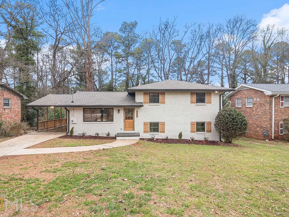 Gorgeous four-sided brick split-level has been completely renovated and reimagined! Walls were removed to create an open and entertaining floorplan between the kitchen, living room, and dining room. Fabulous high-end kitchen has all new soft-close cabinets with pantry, large island with seating for 4, quartz countertops, Whirlpool stainless steel appliance package, and tile backsplash. Massive primary suite on the lower level has enough space for a bedroom and sitting area with a decorative fireplace, giant walk-in closet, and an ensuite bath featuring a soaking tub, double sink vanity, quartz counters, walk-in shower with frameless glass, and linen closet. Two additional full baths have all-new tile, tubs, vanities, toilets, and fixtures. New and refinished real oak hardwoods throughout all levels. Large laundry room and plenty of storage throughout the home. The exterior features 2 brand new decks - one off the open living/dining/kitchen space on the main level, and one off the primary suite on the lower level. Full privacy fenced yard is ready for pets and family gatherings. Covered parking in the carport with driveway parking for at least 3 additional cars. Super convenient to I-285 and an easy walk to the local schools.
