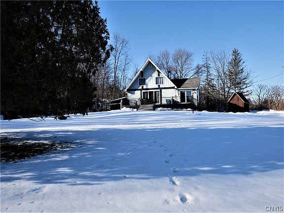 Nestled on 2.3 country acres you will find this charming chalet with picturesque country view! This lovely home boasts cathedral ceilings, lots of natural light, a inviting country kitchen, a spacious living room with a cozy wood stove and two first floor bedrooms, the primary bedroom on the second floor overlooks the living area below! The full basement is partially finished and is perfect for a game room or family room. There is plenty of room to enjoy country living from the expansive deck and patio area, and there is even a fenced in yard area for pets or children. Conveniently located just minutes from Colgate University and SUNY Morrisville.