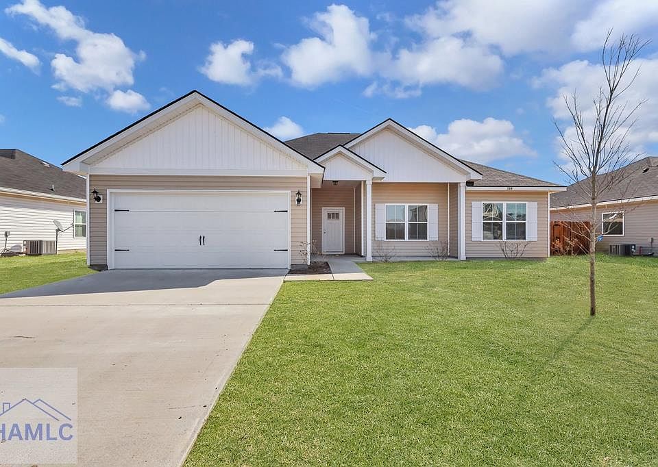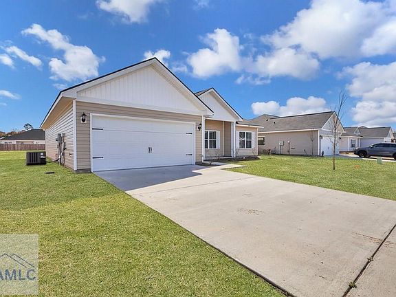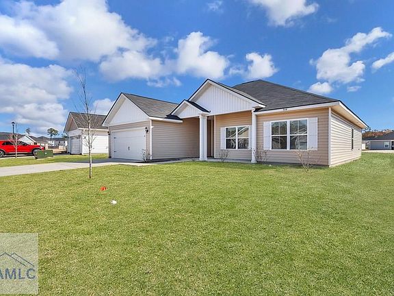 Discover this inviting Ranch-style home featuring an open-concept design with 4 bedrooms and 2 baths! From the expansive front porch, step into a welcoming family room adorned with plank flooring, which seamlessly connects to a back porch and patio. The open kitchen and dining area flow effortlessly into the living room, providing access to the finished 2-car garage. The kitchen boasts rich stained cabinets, stainless steel appliances, granite countertops, a walk-in pantry, and a convenient laundry area nearby. Down the hallway, you'll find three bedrooms and a shared bath, while the primary suite awaits at the end with its vaulted ceiling, private bath featuring a soaking tub, dual vanity, separate shower, and walk-in closet. This home is conveniently located near shopping centers and Ft. Stewart, this home offers both comfort and accessibility.