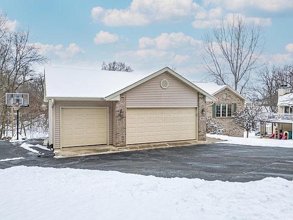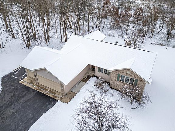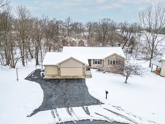 Lots of rooms, super quiet location, beautiful views and a quality built home. Four or five bedrooms if needed. Main floor living room ( 380 sq ft) with vaulted ceiling and wood fireplace ( with gas tube ready to be hooked up). Entry foyer with coat closet. Next room over is the combination dining room/kitchen. A four seasons but unheated enclosed porch leads to the upper back deck and provides a great sitting room/ library or office. Kitchen sink looks out on the adjoining woods. There are two kitchen pantries and a main floor laundry with 1/2 bath. The heated three car garage is 23' deep and a second fridge here will stay. There are three bedrooms and another two full baths on the main floor. The primary bedroom has a coffered ceiling, walk in closet and full bath with separate shower and jet tub overlooking the fields out back. Quality six panel hardwood doors throughout the home. The steps going to the walk out lower level are deep and wide for easy and safe passage. Downstairs is a fourth bedroom with trayed ceiling, full bath and fifth bedroom / rec room. Note the large under stair storage room. But the real fun is in the bar. The beautiful 16.5' single slab of wood is imported from Minnesota. There is a sink, ice maker, microwave and fridge. The two TV's and barstools are negotiable. Pellet stove is included but as is. There is a sliding door to the back covered patio with wood and field views. Seller is ready for quick closing and moving due to change of employment out of state. A home warranty is included. The lot next door is available too for $3500