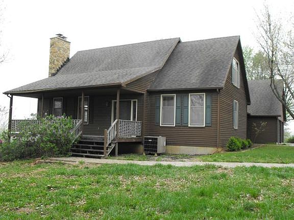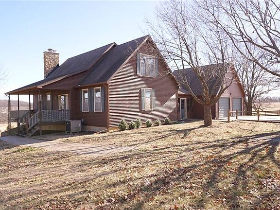 FOUR bedrooms and THREE bathrooms on FIVE acres in the country but close to town. All electric home (KCPL & Rural Water) has very reasonable utilities. TWO wood burning fireplaces, ONE on main and ONE downstairs. TWO stalls and pasture ready for horses or other animals. The breezeway is attached to the TWO car garage plus the outbuilding has THREE parking areas and a studio area upstairs with a furnace and shop downstairs. Enjoy looking out on the grove of trees and not far from Douglas State Lake.