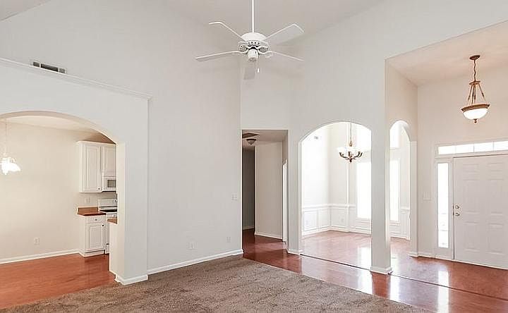 Immaculate 3 bedroom, 2 bathroom rental home in Newnan, GA with high ceilings throughout and gorgeous hardwood flooring! The great room boasts a stunning fireplace and flows into the eat-in kitchen. All four bedrooms are generously sized and the master bedroom includes a private bath. The patio in the beautiful backyard is ideal for outdoor entertaining! Located in the Summergrove community, which surrounds a lake and offers a pool, a clubhouse, a park, a playground and a tennis court.
