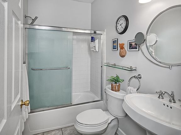 Stylish South-Facing Jacobs Ferry Albany style home. Pride of Ownership abounds! Hardwood floors throughout. One of only a few Albanys with full bathroom in master bedroom. Rec room downstairs being used as third bedroom. Built-in speakers. Ceiling fans throughout. Granite counters, custom backsplash and stainless steel appliances in gourmet kitchen. Chair railing, sconces and shadow box molding in dining area. Newer A/C condenser and water heater. Parking for two cars; one in private garage and one in driveway. Community features two pools with jacuzzis, tot lot, waterfront promenade, park, and free shuttle to ferry. Steps to 158 bus to NYC. Close to restaurants and shopping.
