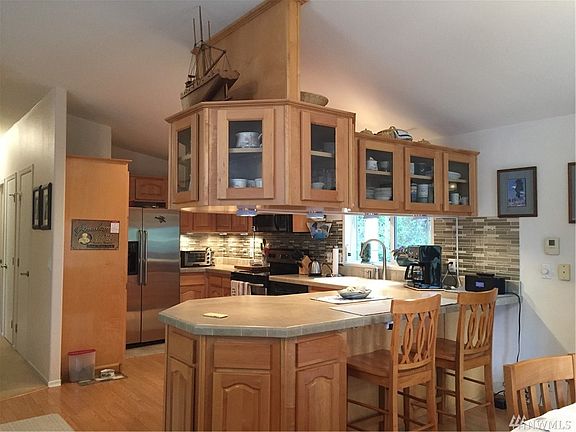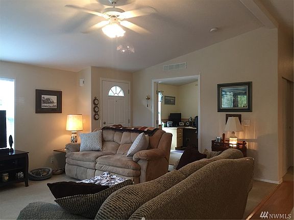 Beautiful home on leased land where the septic is taken care of by the park. Low maintenance landscape. 2 bedroom w/den, open floor plan, Large master with on suite that has a soaking tub and separate shower. Extra large garage and carport, room for your toys or hobbies. Very private back yard overlooking Port Townsend Bay, barbeque, stay warm by the propane fire pit or just relax on the large patio. There is a hook up and dump for an R.V. and plenty of room to park. Very friendly neighborhood