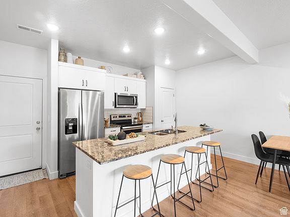 Welcome to this luxury townhome in the coveted, amenity filled, Elk Mountain subdivision. Featuring a modern design and finishes including an extra large center kitchen island, granite countertops, subway tile backsplash, beautiful white cabinets and smart home thermostat and doorbell.This ideal open plan has an expansive feel and flow. There are three bedrooms all on the same level including a private master bedroom, master bath with a deep soaker tub and a generous walk-in closet. You may never want to leave your personal suite. The front door faces to the west and opens up to a massive green grass field perfect for enjoying your time outdoors. Steps away there is also a playground for the younger ones and just beyond that there is a gorgeous clubhouse complete with gym, pool, hot tub, conference room and gathering room. Other perks include VERY kind neighbors and an extra large garage(fits fulls size truck) offering plenty of space that has been fully painted inside to boot making it truly stand out from the moment you pull into your new home. There is also the new MASSIVE Black Smith Fork Park just across the street. This insanely perfect park has everything you could ever want! It boasts multiple playgrounds, pavilions, amphitheater, basketball and tennis courts, two dog parks, a skate park, bmx bike pump track and a splash pad to cool off on those hot summer days!