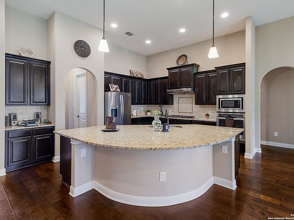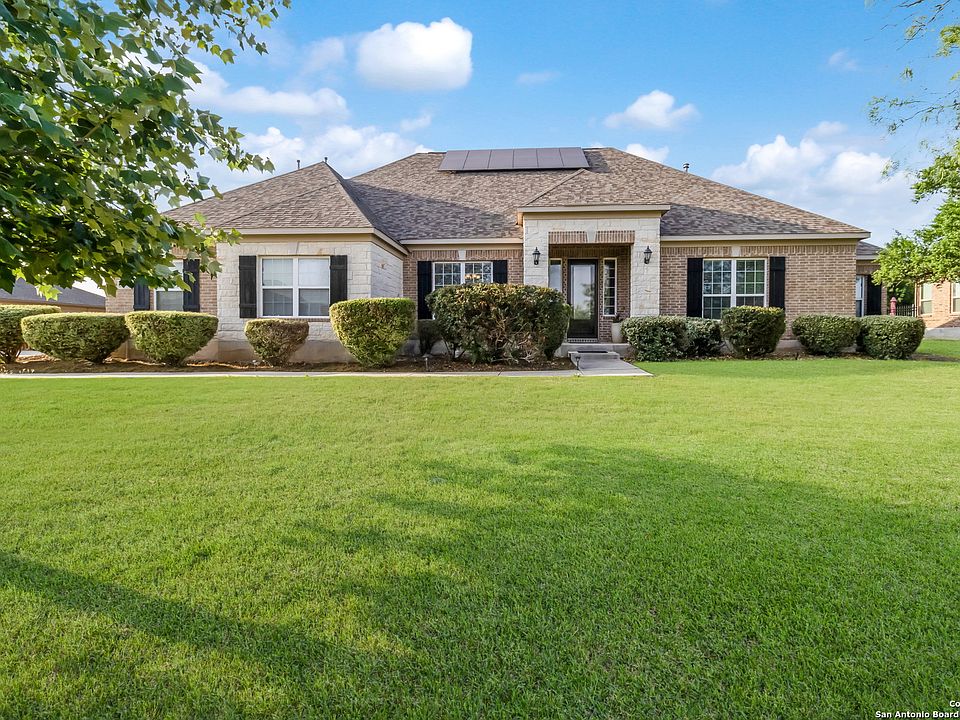 Fully paid off solar panels mean immediate savings for you!! Welcome to this stunning 3-side brick home in the prestigious gated community of Potranco Ranch. Situated on a spacious half-acre lot, this 3,324 sq ft residence offers a rare combination of elegance, modern updates, and practical upgrades that truly set it apart. With fully paid-off solar panels and a whole-home water filtration system, this home is as efficient and low-maintenance as it is beautiful. The roof is just 2 years old, offering peace of mind for years to come. Inside, you'll find a well-designed layout that includes a formal dining room at the front of the home-perfect for entertaining-and a large living room that flows seamlessly into the kitchen, complete with a butler's pantry for added storage and convenience. The home boasts a spacious game room ideal for fun or relaxing movie nights. Retreat to the primary suite where the bathroom has been tastefully renovated to include a sleek stand-up shower and a soaking tub, creating a spa-like experience. A secondary bedroom also features an en suite bath with a modern stand-up shower, making it ideal for guests or multi-generational living. Every inch of the home reflects meticulous care and thoughtful upgrades Conveniently located, this home offers quick access to both the charming small-town feel of Castroville-known for its unique shops and local dining-as well as the rapidly developing retail and restaurant scene just minutes away on Potranco Road. For those commuting to Lackland AFB, the drive is under 30 minutes, making this an ideal location for both comfort and connectivity. Rounding out this exceptional property is a side-entry 3-car garage, offering both curb appeal and ample parking. From its generous square footage and modern touches to its eco-friendly features and prime location, this home is the perfect blend of comfort, style, and functionality. Don't miss the opportunity to make it yours.
