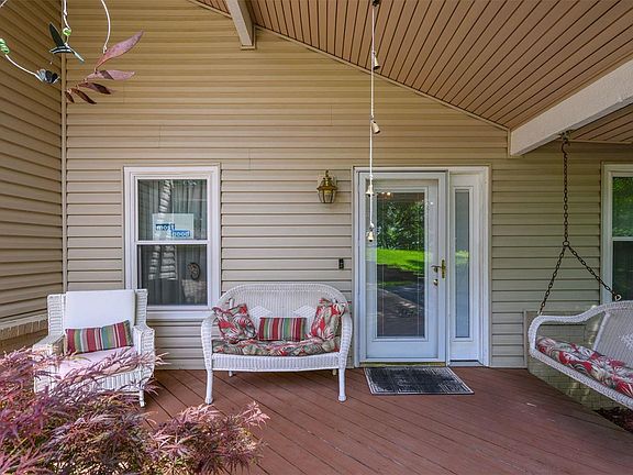 Dramatic Price Improvement! 1.8 Acres! Step into a center hall w/ wood floors and discover an open living and dining area that has a vaulted ceiling. The updated kitchen (2022) features granite countertops, a deep double sink, solid wood cabinets with soft-close drawers, pantry, and under-cabinet lighting. The family room has a brick wood-burning fireplace, access to deck w/ serene views of the 1.8-acre partially fenced lot with mature trees. A versatile bonus room offers space for a home office or fourth bedroom. The primary suite is a true retreat w/doors opening onto the deck. The renovated en-suite bathroom includes dual vanities, a shower, and an oversized soaking tub. Additional highlights include a full unfinished walkout lower level with rough-in plumbing for a third bathroom, a new energy-saving heat pump/furnace (2023), Anderson windows and doors, a house fan, and a central vac. This private home is on a quiet forested street in the hills, minutes from convenient shopping.
