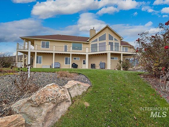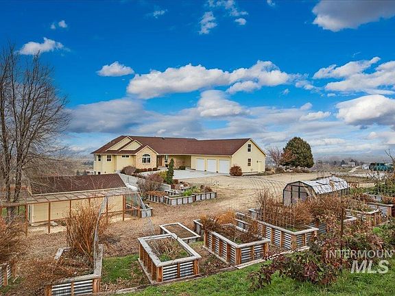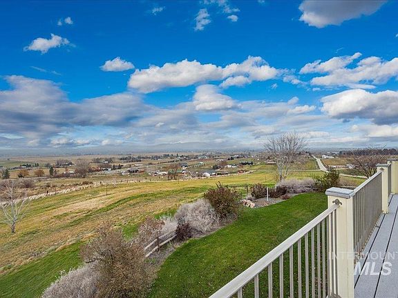 Perched high above the valley with majestic 360-degree panoramic views, this property has been fully overhauled & home updated since 2023.This 5beds, 5baths, 5,802 sqft single-level home with walkout basement sits on an expansive 48acre estate & backs directly to BLM land for ultimate privacy & endless recreation. Boasting new luxury flooring throughout, fresh interior paint, & beautiful wood accents, this stunning property offers versatile living options—perfect for multi-generational families, homesteading, or even event venue/vineyard. The kitchen is a chef's dream, flooded w/ natural light & breathtaking views, featuring two spacious islands, granite countertops, Dacor appliances, & rich Alder wood cabinetry. Retreat to the tranquil primary suite with sweeping vistas, a jetted soaking tub, dual sinks, oversized full-tile walk-in shower, and a massive walk-in closet appointed with luxurious Alder wood built-ins. Unique amenities abound: a convenient basement shop with direct loading dock access, climate-controlled safe room, greenhouse, chicken coop, silo, foundation pad ready for a 22x50 shop/outbuilding perfect for an ADU option, and 13 acres of fully irrigated land w/ established system in place-ideal for farming, gardening, or livestock. Embrace the endless opportunities of rural luxury living less than 50 min from Boise! Additional features in docs tab-far too much to list.