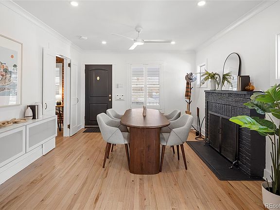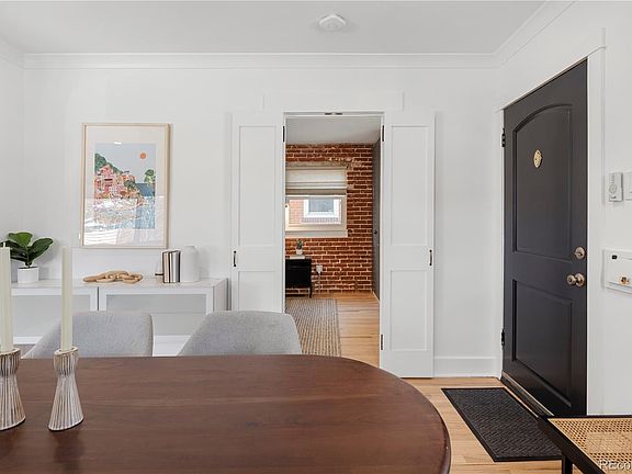 Thoughtfully renovated with a permitted remodel, this home blends historic charm with modern style and functionality. The light-filled interior includes an open living and dining area with freshly refinished hardwood floors, a wood-burning fireplace, and newer windows with custom Hunter Douglas shades and shutters. The primary suite exudes character with exposed brick and dual wardrobes. The ensuite bath offers a spa-like experience with Hansgrohe rain and hand shower fixtures. Pocket doors maximize space, allowing privacy in the shower while keeping the half-bath accessible for guests. The kitchen includes stainless steel appliances, white cabinetry, quartz countertops, Rejuvenation brass hardware, and Muuto pendant lighting. Just beyond, a stairwell leads to the backyard and a basement with lock-off potential—an excellent option for those who want to offer private access to house mates. The lower level offers impressive versatility, with an open flex space perfect for a home office, gym, or play area. Two large conforming bedrooms, a full bathroom, a laundry center, and extra storage complete the space. Outside, the recently landscaped backyard extends the living area with a covered patio—ideal for entertaining, grilling, or enjoying Denver’s abundant sunshine.