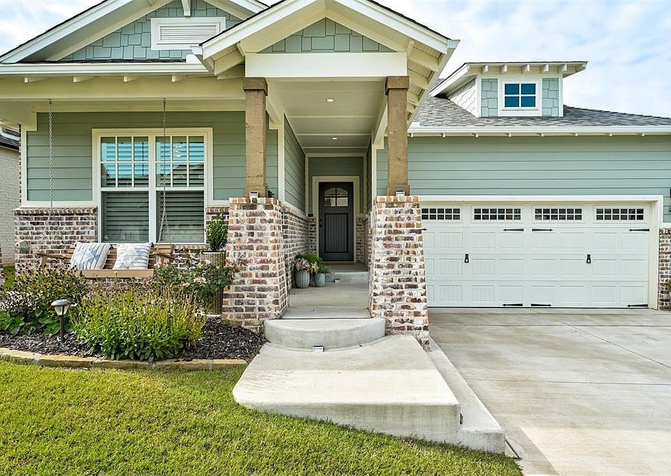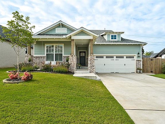 McCaleb Homes 'Wright" Floor plan! This luxury 3 bed, 2 bath Craftsman style home is under $400k and comes with a hot tub!!!(2024). Light and bright with lots of natural sunlight, you will LOVE this home! From the charming front porch swing to the outdoor living space with a TV and hot tub, you will feel like you're staying at a luxury vacation home. Spend the day relaxing pool side then come home to spend the evening in your own private hot tub while having a mocktail and entertaining friends. Or you can just view the sunrises, sunsets and stars from the privacy of your backyard spa. In the Primary Bath a beautiful mosaic window casts a kaleidoscope of colors at twilight. The kitchen has a large island, walk in pantry and a planning center. Custom wood shutters, 5" wood style tile flooring, crown molding, quartz counter tops, updated lighting for the dining room, guest bedroom, entryway, & patio ceiling fan. The patio has been extended to also wrap around the side, and trees have been added across the backyard.