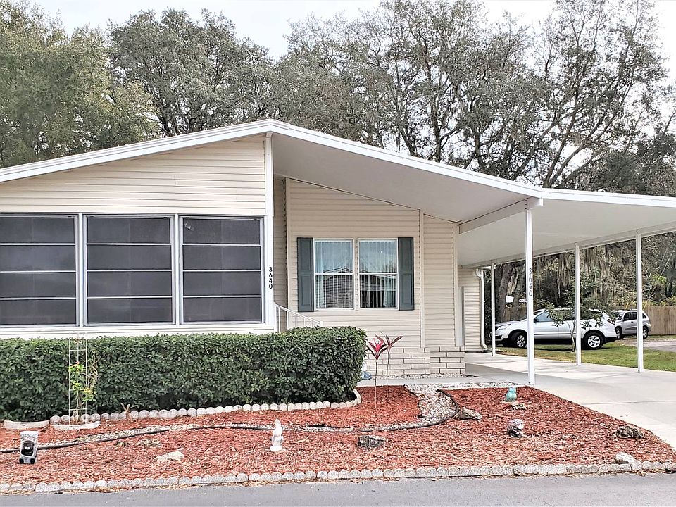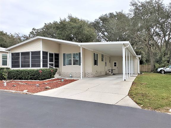 This home is on LEASED LAND with a monthly lot rent of $150.00 (THAT'S RIGHT! $150.00!) in Southport Springs Golf and Country Club 55+ community. Palm Harbor Home 2 bed/2 bath and a Florida room. AC new '18, membrane roof '17. Fully-furnished home with golf cart. Buyer takes possession of home in early April. Southport Springs Golf and Country Club is where you will want to call home after all your hard work. Start living the good life in the beautiful Sunshine State. KITCHEN (9' x 10') Galley-style kitchen has plenty of cabinets and counter space. Appliances include a Frigidaire smooth-top stove, Kenmore built-in microwave, Amana side-by-side refrigerator with water and ice maker, and an Admiral dishwasher. The flooring is ceramic tile and there is a three-cabinet pantry. Pots, pans, dishes and flatware all stay. DINING AREA (10' x 10') Table and 4 chairs remain with the home. Wood laminate covers the floor. There is a lighted ceiling fan and a corner china cabinet. LIVING ROOM (16' x 19' 3") Huge room has a lighted ceiling fan and carpet. Furnishings include matching sofa and chair, 2 recliner/rockers, a large entertainment center, 2 pairs of matching end tables, 2 lamps, an electric fireplace and a 37" Panasonic flat screen TV. MASTER BEDROOM (12'8" x 13'5") The floor is covered with carpet, there is a lighted ceiling fan and a large walk-in closet. The queen bed, 2 night stands, 4 lamps, matching chest and dresser, 2 shelf units, 2 wooden chairs and the 20" RCA TV remain. MASTER BATH Has a wide, single-sink vanity with large cabinets and drawers, a medicine cabinet and a three-door linen cabinet. There is a walk-in shower with grab bar. The flooring is ceramic tile. GUEST BEDROOM (10' x 12'9") Good-size room with a walk-in closet. Items that stay include the queen bed, nightstand, three lamps, dresser, chest, computer desk and two metal shelf units. This room has a lighted ceiling fan and ceramic tile flooring. MAIN BATH Large bathroom with wide, single-sink vanity that has a lot of cabinets for storage. There is a tub/shower unit with grab bar and a medicine cabinet. The floor is covered with ceramic tile. LAUNDRY AREA is located behind bi-fold doors in the hall near the side entry door. The GE washer and dryer remain. There are plenty of shelves to store your supplies. Ceramic tile floor. FLORIDA ROOM (10' x 13') is enclosed with vinyl windows. The floor is carpet. A table, 5 chairs, ottoman, loveseat, end table, and 2 lamps stay. EXTERIOR Huge back yard with woods behind. The home has vinyl siding. AC '18, '17 membrane roof, lawn irrigation and owner has pest control service. The 10' x 12' golf cart shed has a workbench with electricity and shelving. The '04 Club Car Golf Cart stays. The 2- car carport also covers the Florida room entrance. Southport Springs Golf and Country Club is the premier manufactured home, 55+ community in Zephyrhills. THE LOT RENT FOR THIS HOME IS $150.00 PER MONTH. There is an additional pass-on tax of $55.84 per month and a monthly trash pick-up fee of $12.18. Zephyrhills water is billed through the park. Shopping, restaurants, a hospital and medical offices are all close by. All listing information is deemed reliable but not guaranteed and should be independently verified through personal inspection by appropriate professionals. American Mobile Home Sales of Tampa Bay, Inc. cannot guarantee or warrant the accuracy of this information, measurements or condition of this property. Measurements are approximate. The buyer assumes full responsibility for obtaining all current rates of lot rent, fees, and pass-on costs. Additionally, the buyer is responsible for obtaining all rules, regulations, pet policies, etc., associated with the community, park, or home from the community/park manager. American Mobile Home Sales of Tampa Bay, Inc. is not responsible for quoting of said fees or policies.