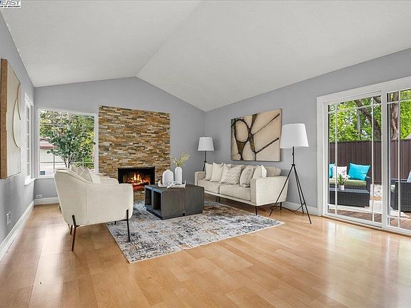 This charming townhome offers 1,016 square feet of living space in Fremont's tranquil Trees Gardens community. The home features abundant natural light and vaulted ceilings, creating an open, airy atmosphere throughout. The updated gourmet kitchen is equipped with modern appliances while the living room includes a wood burning fireplace—an entertainer’s dream. Gleaming laminate flooring runs throughout the freshly repainted interior. The backyard is perfect for relaxation with a hot tub, mature fruit trees, and two decks—and the community pool is close by. Conveniently located near Quarry Lakes Regional Recreation Area, Alameda Creek Regional Trail, major highways, and local shops and schools, this home is the perfect blend of comfort and accessibility.