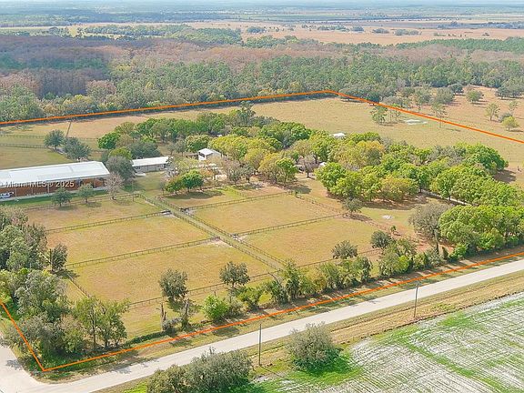 Equestrian facility with plenty of land (38+/- acres), a guest house, covered steel arena, 2 horse barns, storage buildings, covered equipment parking. 2-story, 3-bedroom, 1 ½ bathroom, with stone floors and granite countertops. The guest house is a 1-bedroom, 1-bath, stilt home, high and dry with a balcony and private entrance. 2000’ grass runway AIR STRIP, and a small hangar/carport. Engineered metal and concrete barns with utilities, a bathroom, an air-conditioned hay barn, multiple water wells on the property, septic and lift stations, drainage culverts, fenced and cross-fenced, pastures, and turnout. Barn office, tack room, feed room, hot walker. 20,000 sq ft 25’ high steel-covered riding arena, 2 separate horse barns, ready for your horses this year, here in Florida.