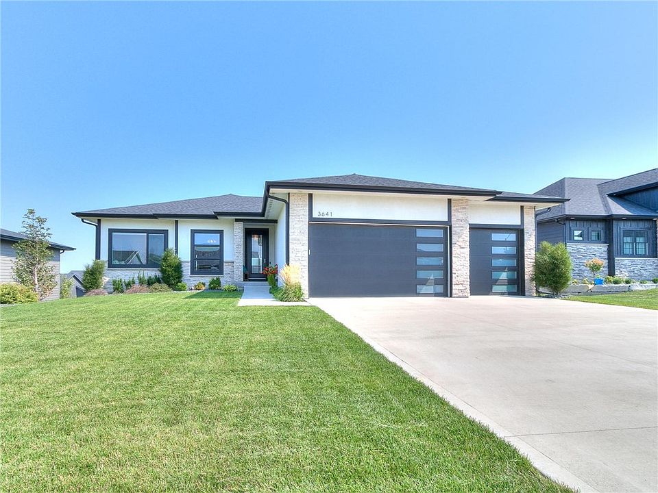 You will not want to miss out on this gorgeous, almost NEW, modern home!! Built 3 years ago, and very lightly lived in, this home is better than new with 3,000 finished SQFT, located in a prime Clive location! You will be welcomed by a grand entry featuring 12' ceilings leading to an open concept floor plan, oversized windows and 9' ceilings throughout. Beautiful hardwood floors flow through the main area, and long-lasting, low profile carpet is in all bedrooms, stairs and the basement. In the kitchen you find a large island great for entertaining, a walk-in pantry and high quality appliances! LG fridge, GE electric oven, KitchenAid Convection microwave, & induction stove top (gas line ran). Off the kitchen, a dining area leads to a beautiful covered deck ideal for summer nights overlooking the beautiful landscaping and large, fast growing trees. Off the living room, you'll walk into the private master suite with a large master bath featuring, dual vanities, tile rain shower and a walk-in closet connected to the laundry/ mudroom! On the other side of the house, you will find two generously sized bedrooms & a full bath completing the main level. The walkout basement boasts a huge family room and a wet bar! Outside on the lower level, you will find a covered patio! Additional home features; irrigation, passive radon system installed, wired for Tesla charging outlet in garage and epoxied garage floors. Installed outdoor automatic low-voltage up-lighting on front of the home.