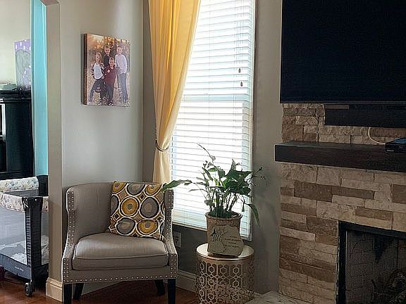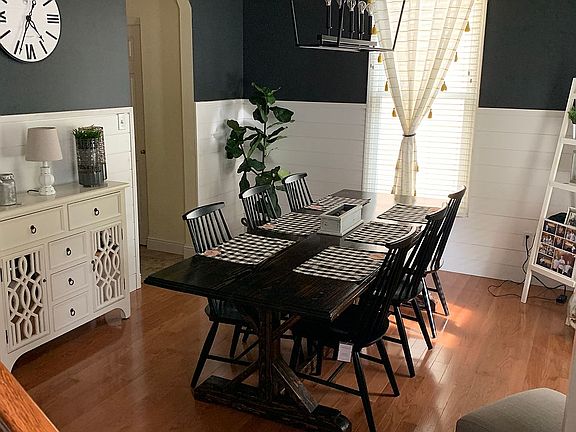 First floor has wood floors in Living Room, Hearth Room, Dining Room, 1/2 bath and Master bedroom which is located on main floor, vaulted ceilings and large walk-in closet. The kitchen and laundry room have porcelain ceramic tile in neutral color. 4 Bedrooms upstairs with one having a jack n jill bath as well as another full bathroom upstairs. Covered Porch on the back side of the house with a oversized stamped concrete patio. Fenced in backyard and oversized detached 2 car garage. Zoned heating and cooling.