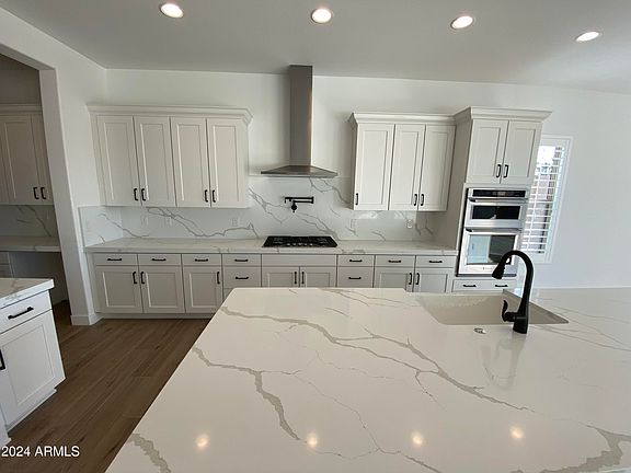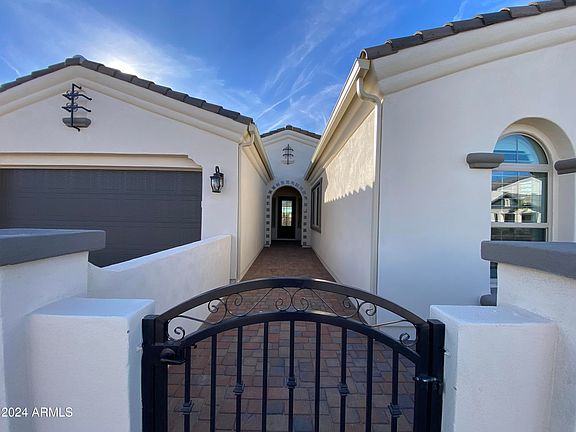 The Reserve at Red Rock, a gated resort style Community set in the Foothills of Northeast Mesa. The Reserve features approximately 48% open space, preserved desert, palm lined entries, a central clubhouse with resort pool, fireplaces, pickleball, gym, more. Excellent access to the natural desert and regional park space, shopping, and Freeway. The home is situated on a corner lot, backing up to open space, and palm trees. The very popular Residence 5 Floorplan features an oversized island kitchen, with ample cabinetry, feeding into both a spacious walk in and butler pantry. The split floorpan provides excellent privacy. Disappearing wall of glass opening up to the covered patio. Taxes estimated! Very near move in Ready.