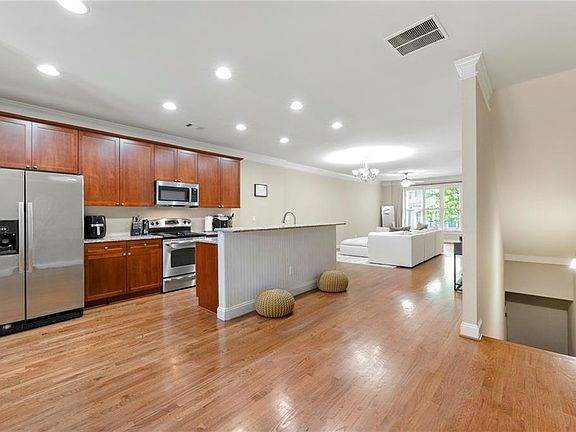 Nestled in the heart of the Historic College Park neighborhood, this stunning three-bedroom, 2.5-bathroom townhome is a true gem, blending modern elegance with unbeatable convenience. The main level features an open-concept design perfect for entertaining, with a spacious living room, dining area, and a kitchen that exudes sophistication. Boasting beautiful cabinets, a large island, and stainless steel appliances, the kitchen seamlessly opens to a generous deck ideal for summer gatherings. This level also includes a half bathroom, a coat closet, a pantry, and a amazing view to the deck. The second floor offers a serene retreat with a luxurious primary suite featuring an oversized spa-like bathroom with a separate shower and soaking tub, as well as a custom walk-in California closet. The second bedroom, equally impressive, includes its own en-suite bathroom with a shower/tub combo and a walk-in closet with a bonus room attached. The unfinished basement provides an additional bedroom and full bathroom, offering versatility in the future for guests or a home office. Located just five minutes from the airport, parks, restaurants, and the charming Main Street Stroll, this home places you 10 minutes south of downtown Atlanta and mere moments from major expressways, including 75/85 and 285. With 100% financing available, this is your chance to fall in love with a home that offers both style and convenience. Don't miss this incredible opportunity! NEW ROOF HVAC 3 YEARS OLD