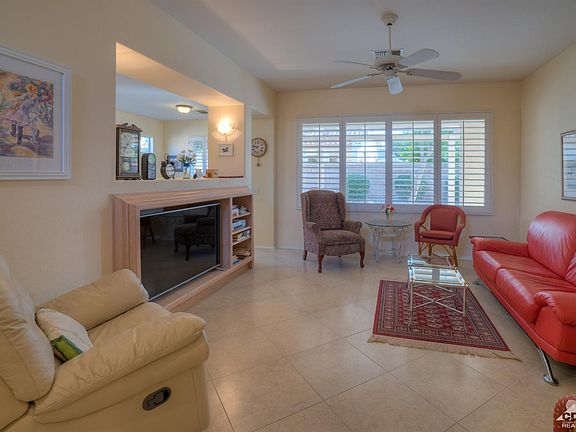 Sun City Palm Desert - Lanai. This 2 bedroom, 2 bath with office is a short distance to the Sunset View clubhouse. It has an east facing rear yard with an extended patio, alumawood cover and shade trees. Inside, 18 inch diagonally laid tile is in all except the bedrooms. Shutters are throughout. The eat-in kitchen has slab granite counters, an extra deep stainless sink; updated faucet and cabinet hardware. The master bedroom has a walk-in closet and view of the backyard. The master bath has dual sinks, a stall shower and linen storage. Guest bedroom has mirror closet doors. Guest bath has a shower/tub. All bath surfaces are cultured marble. The laundry room has been converted to small office with a built-in desk w/slab granite desktop. The room can be converted back to a laundry room if desired. The extended 2 car garage has built-in cabinetry and room to tandem park a golf cart.