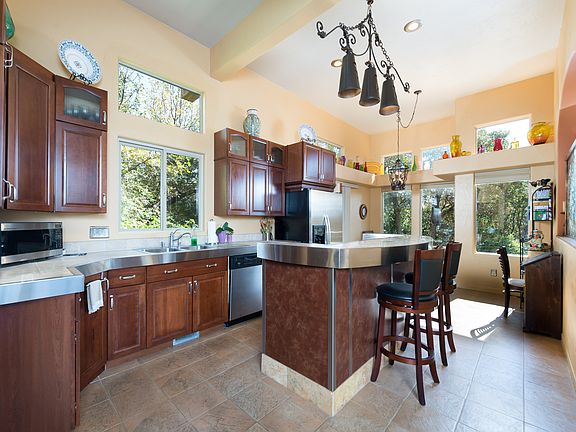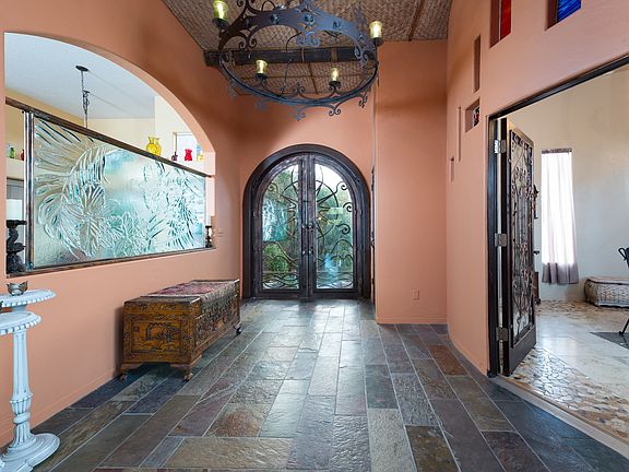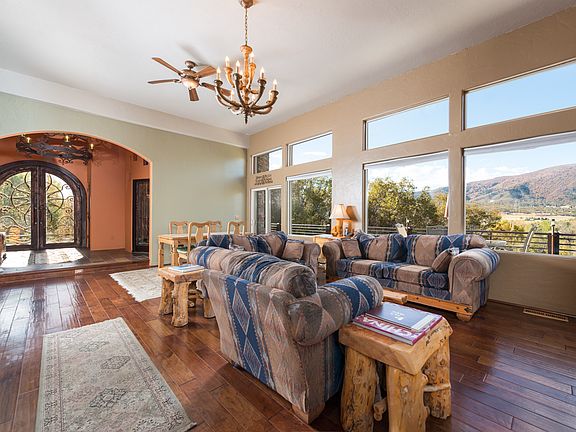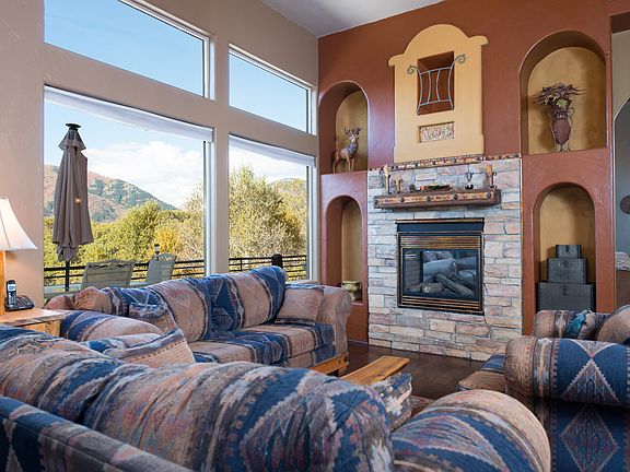 This warm Tuscan style home in Patio Springs is perched on the side of a hill and backed on the North by wooded open space. With unmatched panoramic views, eclectic design, and custom luxury finishes throughout, this unique Ogden Valley home is an exclusive gem. As you walk up to the front entrance, you are greeted by two custom made glass and iron arched doors which set the theme for this eclectic home. Open the doors and enter the foyer where you are welcomed by beautiful custom chandelier and a custom glass dividing wall that was once a door in a Las Vegas casino. Off to the left is the turret room which can be used as a den, library, or formal dining room. Step down into the large formal living area and look out of the windows at the amazing views of Ogden Valley and Nordic Valley Ski Resort, or walk out onto the adjacent deck which runs the length of the home and relax as you listen to the birds in the surrounding trees. A stone surround two-sided fireplace helps divide the sitting room and the family room where a designer wet bar, built-in wall shelving, and extra large windows provide natural lighting.