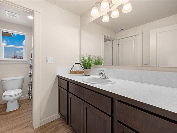 The main suite offers privacy, a dual vanity bathroom, a walk in shower, and a generous walk-in closet. Two additional sizeable bedrooms—share a well-appointed second bathroom, rounding out this carefully crafted floor plan.
