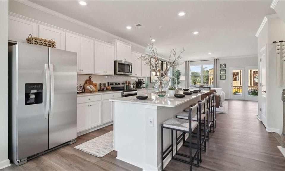 New beautifully crafted easy living three story "Asbury 1" floor plan in the award winning Hapeville community 10 minutes from Hartfield Jackson ATL Airport.     The Asbury 1 floorplan offers three bedrooms each featuring en-suit bathrooms, a half bath on the second level totaling 3.5 baths in total. The ground level includes a two car garage, a nice sized bedroom with an en-suit bath. The second level includes an open concept layout with kitchen overlooking dining and family room. Revwood flooring throughout the main, chef-inspired kitchen offers a large island with quartz countertops and stainless-steel appliances.    The upstairs features two generously sized bedrooms along with a washer & dryer area, luxury vinyl stairs throughout along with high ceilings. In addition to the fantastic location, home owners will enjoy the close proximity to a selection of bars and restaurants in the Hapeville location with a short 15 minute commute to midtown Atlanta.  Townes @