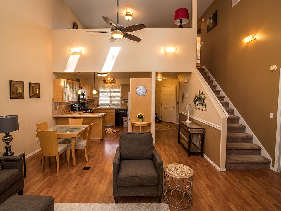 Come for the low maintenance & premier location, fall in love with the custom tile work & main level master. A gorgeous functional kitchen welcomes you home with custom tile counter tops & backsplash. The main level master suite boasts a large master bath w/ walk-in shower, dual vanity, walk-in closet & adjoining laundry room. The second level features a loft for your home office or sitting room as well as a second bedroom w/ walk-in closet & full bathroom. An expansive deck overlooks a serene green space & all The Village's amenities from an outdoor tennis court to an indoor pool & spa. Never shovel snow or mow your lawn again as The Village maintains your landscaping up to your front door step. Centrally located close to Costco, hospitals & all the outdoor recreation CDA has to offer.
