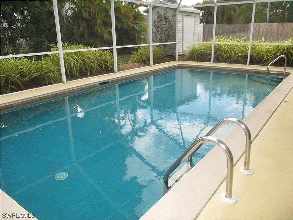 Fantastic furnished and turnkey POOL home in wonderful Country Club neighborhood. Pool is saltwater, and has been resurfaced. Both the POOL and LANAI are HUGE! Perfect area for entertaining or for a great vacation rental (Nice tropical decor). Lanai screening replaced 2023. Roof is also 2023. Impact windows and doors. Yard has sprinklers, fencing, concrete curbing, a storage shed and is well landscaped. Kitchen has Kraftmade wood cabinets, and solid surface countertops. Ceilings have wood beams Tile in main areas, and one bedroom has bamboo floors. All the doors are raised panel doors and the front door has beautiful glass. The front entry is also screened. Also done in 2023, new electric panels, exterior paint, garage door opener (2-Car), gutters and soffit, screen doors on the lanai, and a new dishwasher. Home has been EXTREMELY well maintained. No flooding from IAN! Survey and elevation in supplements.