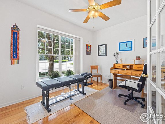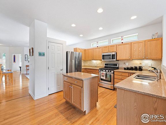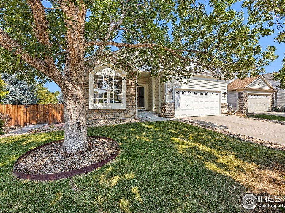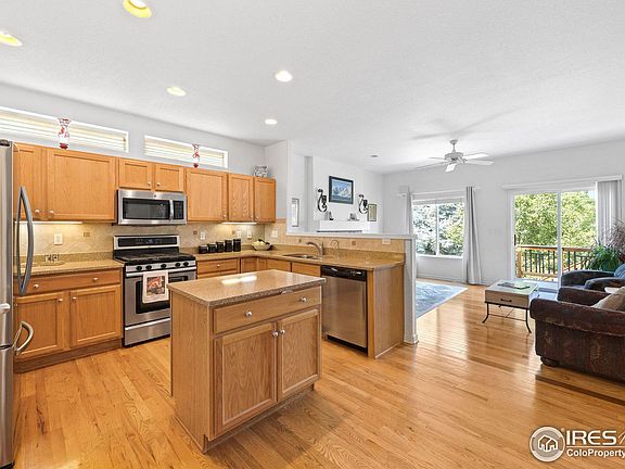 Tranquil Clover Creek Ranch-style home with garden oasis, green space, and trails. This light and bright 3 bed 3 bath home showcases an open-concept main level living, hardwood floors, living room fireplace, at-home office, and private deck. The open kitchen features generous cabinetry, stainless steel appliances, kitchen island, and tiled backsplash. Retreat to the primary bedroom complete with 5-piece bathroom containing double vanity sinks and a generously sized closet. Venture to the finished basement to find numerous recreational opportunities: kick-back, flex space, or at-home gym. The patio door off the main level leads to a private deck capturing mountain sunsets, calm flowing water, and ambient nature sounds. Master garden and landscape design is reflected throughout with blooming flowers, vegetable and herb gardens, and mature trees. Community pool, parks and trails, Top-Rated St. Vrain Schools, and easy access to Village at the Peaks Shopping Center, Whole Foods, Downtown Longmont / Main Street, and Boulder.