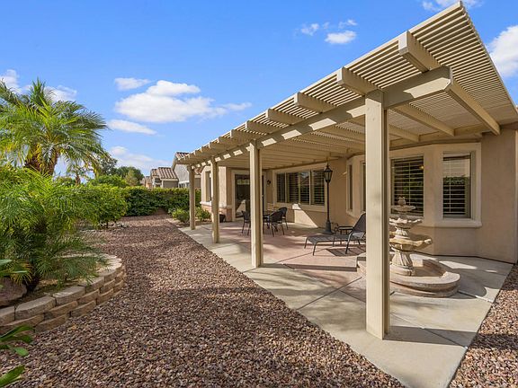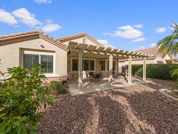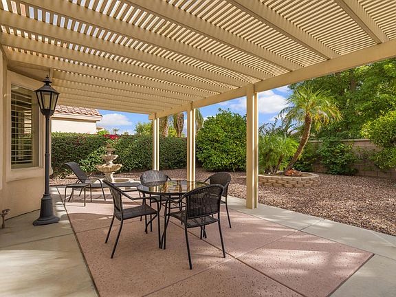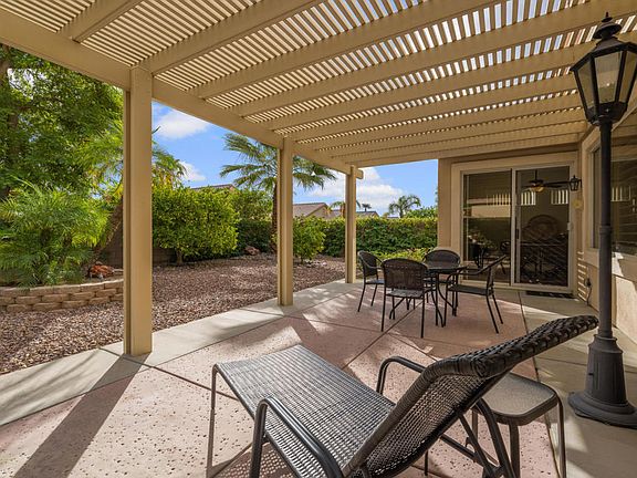 Sun City Palm Desert- Lanai. Available turnkey furnished outside escrow. This lovely Lanai has a spacious east facing private rear yard that is elevated over the yards behind it proving a light and open environment. There is an extended salt finished patio, an alumawood patio cover and lush desert landscaping including palm trees and citrus. Inside tile flooring, upgraded baseboards and shutters are throughout. The living room has built-in media center. The kitchen has corian counters and upgraded black appliances. The kitchen is also plumbed for a gas stove. The primary suite has a bay window and a large walk-in closet. The primary suite bathroom has dual sinks, a stall shower with glass enclosure. A shower/tub is in guest bathroom. Bathroom fixtures and lighting is upgraded. The laundry room has built-in cabinetry. The extended 2-car garage has built-in storage. The water heater in new 2016. Lennox AC new 2018.