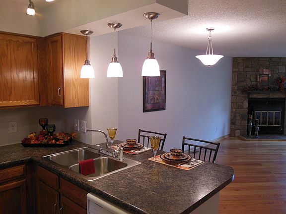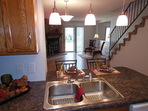 Tastefully renovated and shows like a model! Open concept*lots of natural light*walk out to patio with extra storage*Spectacular upgraded kitchen with new Wilson Art counter tops*opened to dining with breakfast bar*upscale lighting*pantry with shelves*quality hardwood floors in living/dining room*flagstone wood fireplace* new carpet*designer cabinet sink in basement bath*pull down stairs to attic storage*Spacious laundry with cabinets*Bonus craft room with stylish counter and cabinets*community pool*hiking trails.